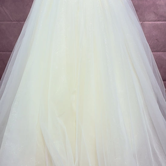 With its twinkling sequin accents, cascading layers of soft ivory tulle, and flattering off-shoulder sleeves, Celeste delivers a timeless princess look without the weight of a heavy train. Whether you’re walking down a candlelit aisle or dancing under the stars, this gown moves effortlessly with you.