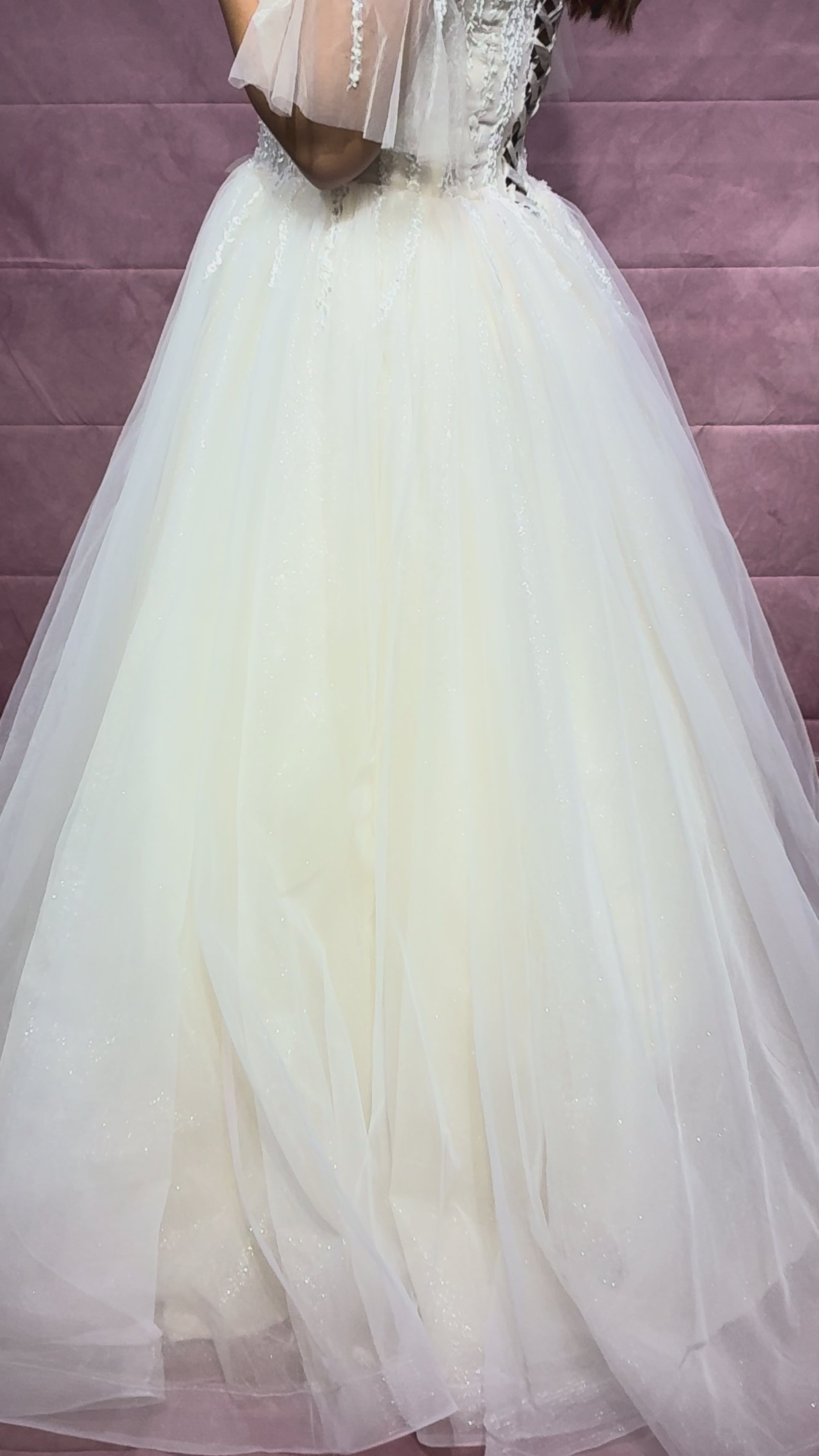 • Shimmery layered tulle skirt without train, perfect for comfort and movement