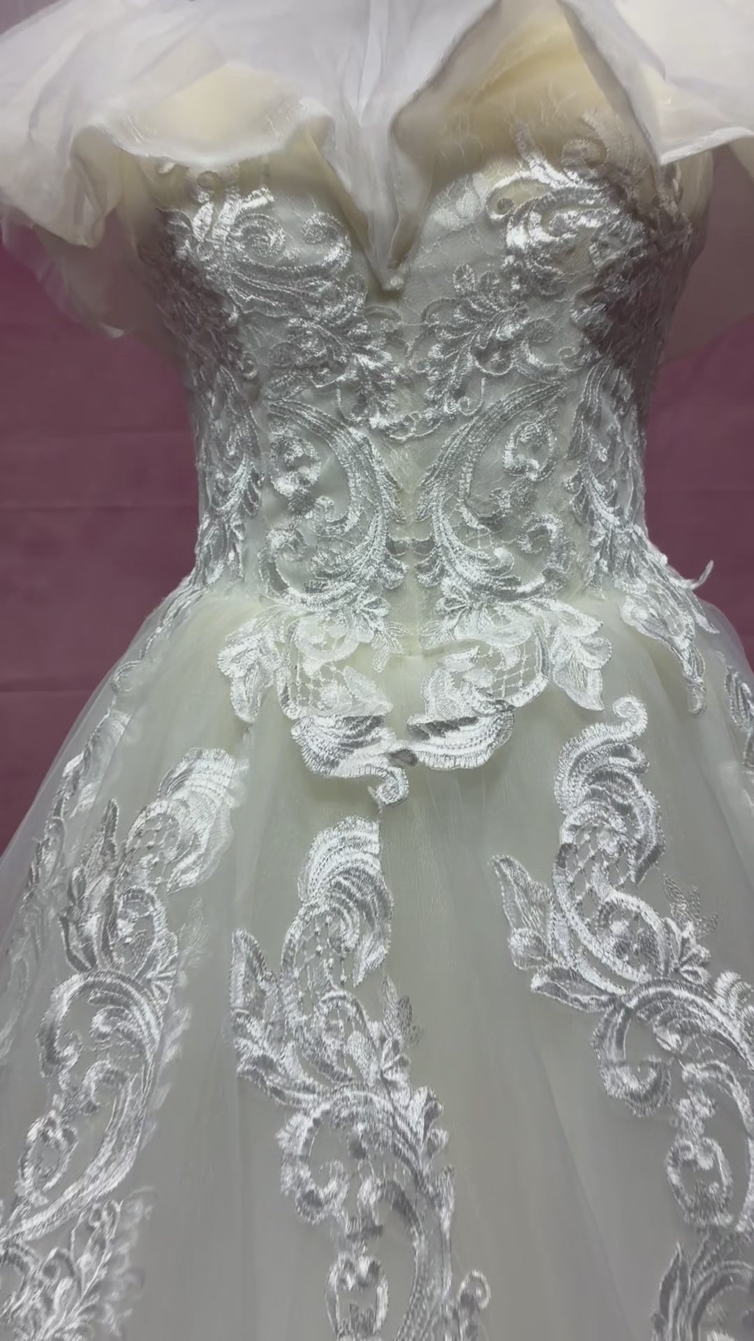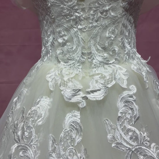 Its lace-up corset back allows a flattering, customizable fit across Medium to XL sizes, cinching the waist for a graceful, hourglass silhouette. The full A-line skirt gently cascades into a 120cm cathedral train, creating a show-stopping moment from every angle.