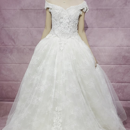 The Elodie Ball Gown Wedding Dress by Rebridal is a regal and romantic choice for brides who love detail and volume. Its sculpted bodice features ornate baroque embroidery, while the full skirt flows into a chapel-length train with delicate lace motifs throughout. The corset back allows a comfortable and flattering fit for sizes S-L, offering both support and flexibility.