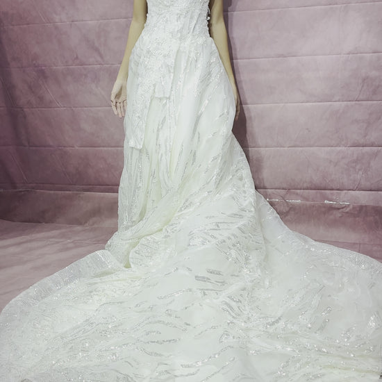 Sequined glitter tulle with linear beadwork, embroidered lace appliqué, soft satin lining; asymmetric draped tulle panel on bodice; light corset boning; lace-up corset back