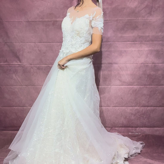 Faye is ideal for the bride who seeks both impact and versatility. The soft glitter tulle layers catch the light effortlessly, while the illusion neckline offers a flattering frame without heaviness. Style it with a low bun, a long cathedral veil, or vintage-style pearl accessories for a truly timeless bridal look.
