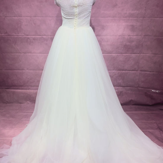 The back features a fully buttoned closure for a vintage-inspired finish, flowing into a clean 120cm skirt with a 70cm modest train—ideal for brides who desire elegance with ease. The waistline is subtly pleated for a cinched look, enhancing the natural silhouette without the need for a corset. Built-in cups offer added bust support without compromising the lightweight comfort of the dress.