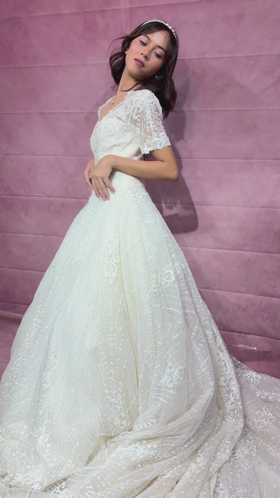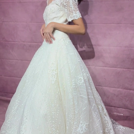 Elegant, regal, and timeless — the Katarina wedding gown is made for the bride who dreams of making a grand entrance. With a sculpted corset bodice adorned in delicate pearls, sequins, and floral embroidery, Katarina flatters and defines the silhouette while offering support and shape. The sheer short sleeves and v-neckline are subtly romantic, while the dramatically flared skirt cascades into an intricate 120 cm chapel train — perfect for brides seeking classic luxury with a modern edge.