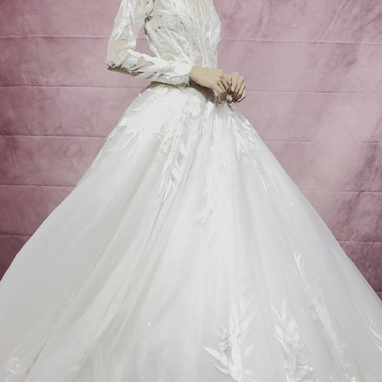 The Rue Ball Gown Wedding Dress by Rebridal’s Wedding Dress blooms with botanical lace on a sheer illusion bodice and long sleeves, flowing into a luminous tulle skirt scattered with leaf appliqués for a modern-fairytale finish.